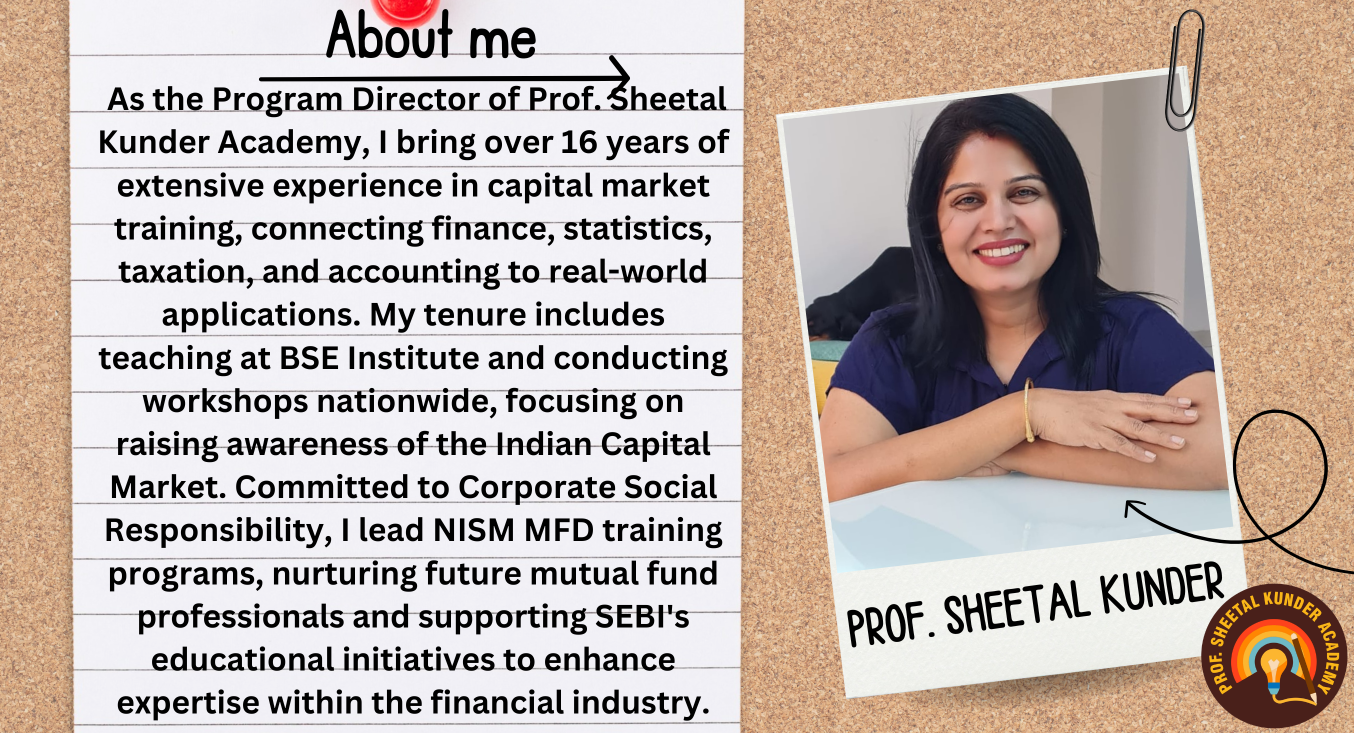 As the Program Director of Prof. Sheetal Kunder Academy, a specialized virtual platform for capital market training, I have established a sustainable, real-world example-driven model to provide learners with hands-on experiences in the dynamic Indian securities market. My philosophy centers around connecting various subjects, including finance, statistics, taxation, and accounting, with the world of finance to demonstrate the diverse applications of financial knowledge