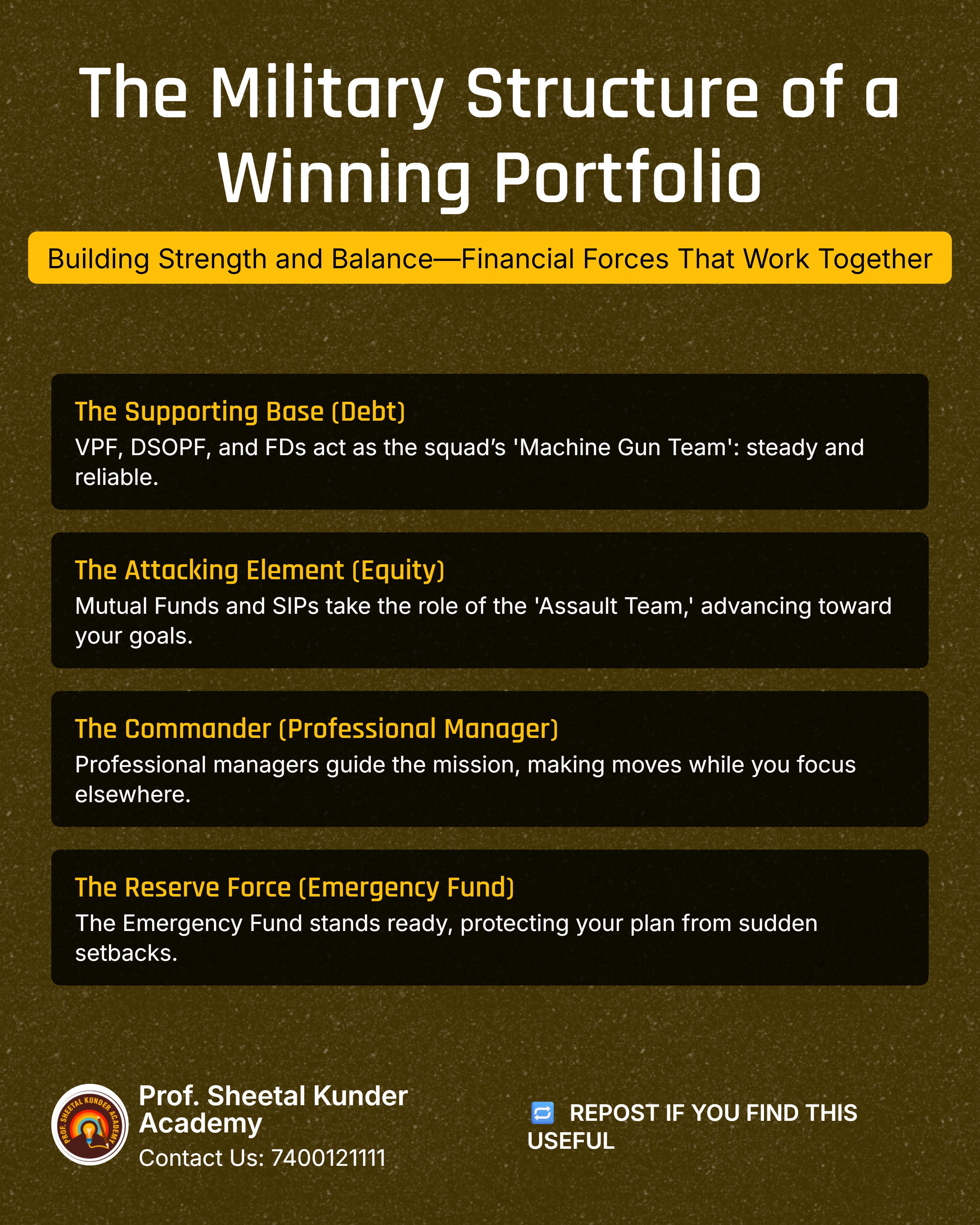 - The Supporting Team (Stability): In an attack, the supporting team provides cover fire with heavy weapons to keep the enemy suppressed. In your portfolio, this is your Fixed Income/Debt component (EPF, VPF, FD). It provides the "leg on the ground" and the stability needed to stay in the game.