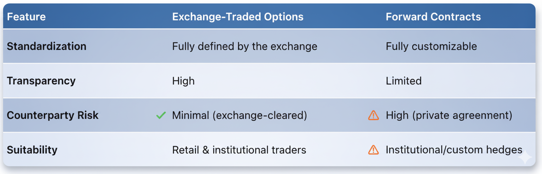 Exchange-traded options offer liquidity and regulatory oversight, while forward contracts cater to customized but higher-risk arrangements.