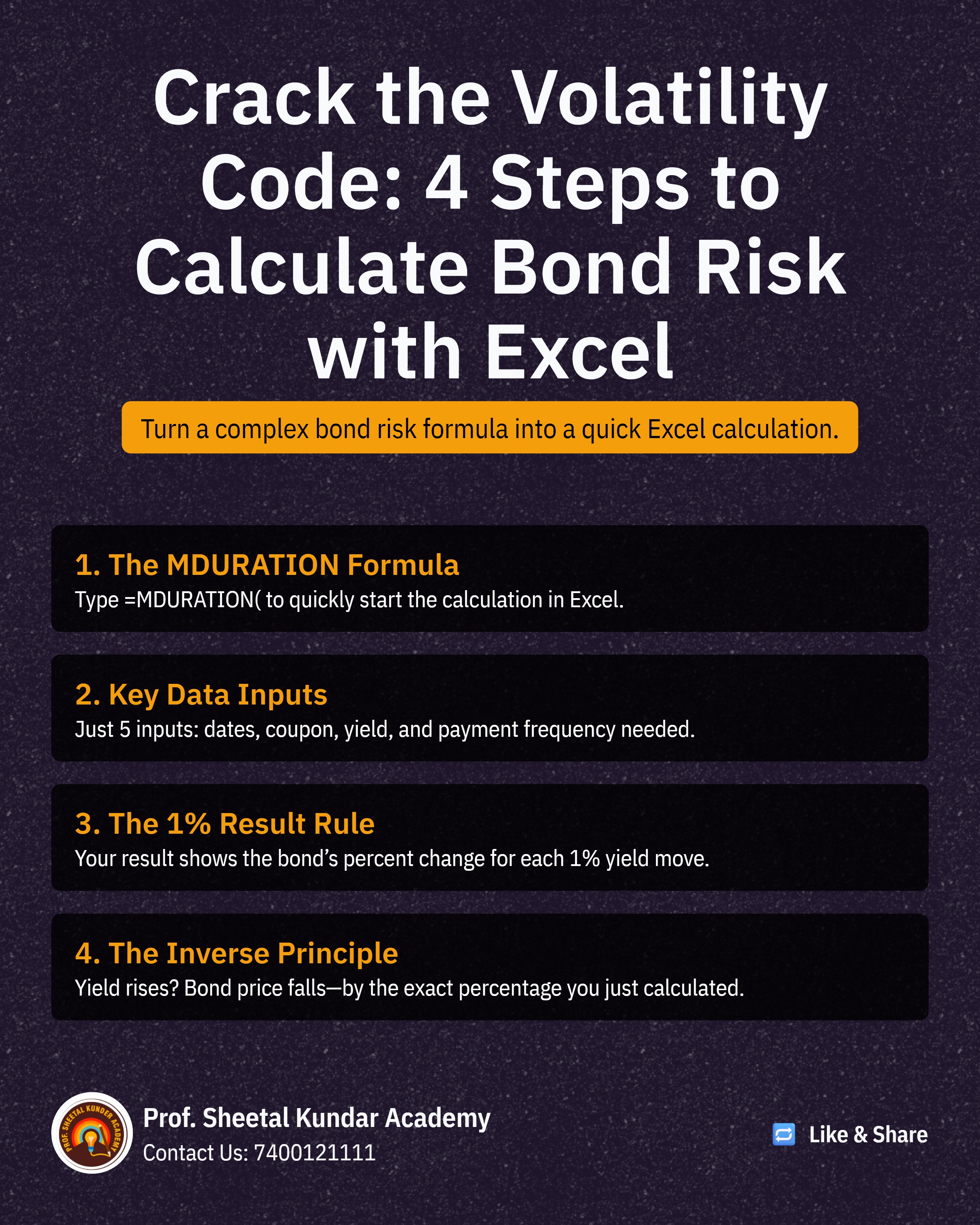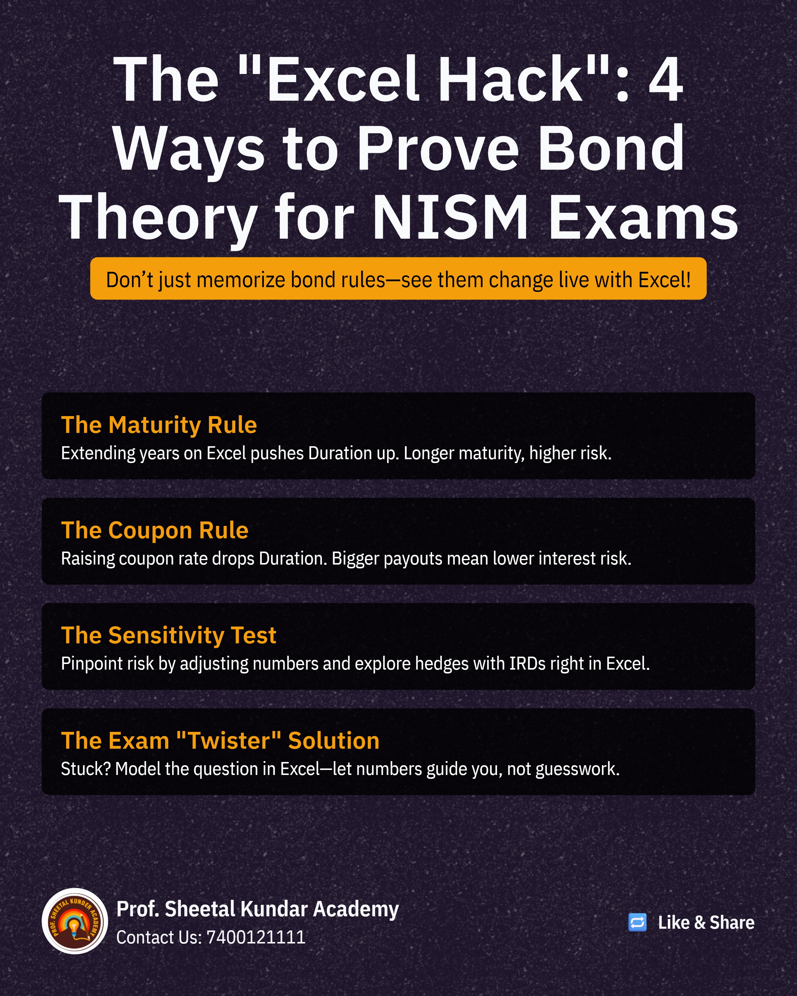 If you are ever confused or faced with a "twisted" question in the exam, you can quickly build a simple Excel example, change the relevant numbers (Maturity, YTM, or Coupon), and use the resulting Duration figure to confidently answer the theoretical question. This technique ensures that your understanding of the numbers dictates your answer, securing your success in the NISM examination.