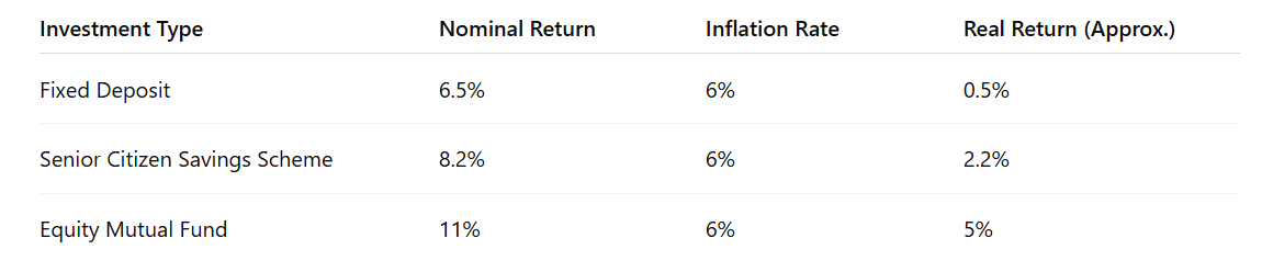 For example, if your monthly household expenditure is ₹50,000 today and inflation averages 6%, you will need approximately ₹90,000 after 10 years to maintain the same lifestyle. While fixed deposits and government bonds may appear “safe,” their real (inflation-adjusted) returns often lag behind inflation. Consider this comparison: