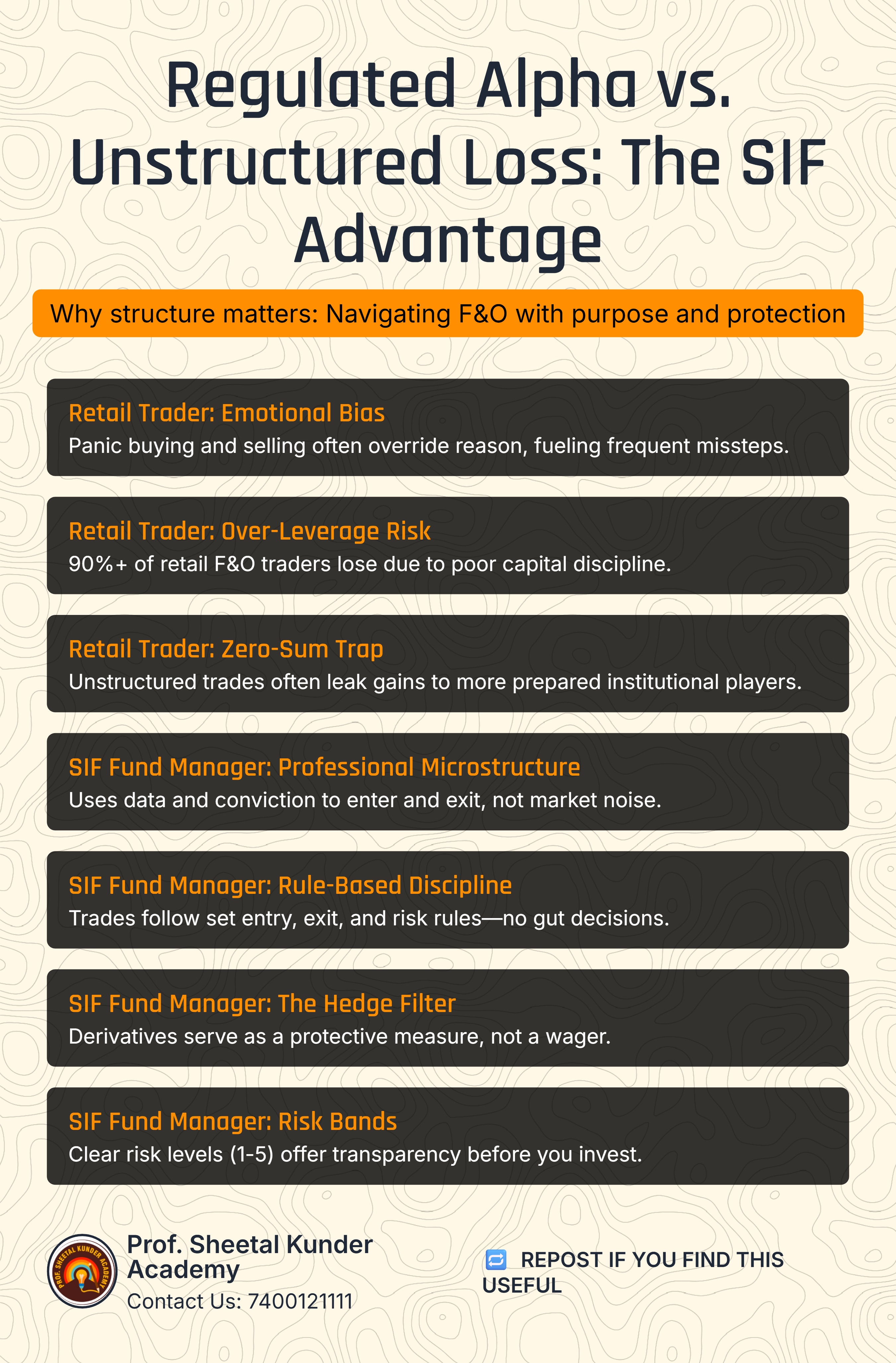 Structured Investment Funds are multi-asset investment products that combine traditional securities with derivative-based strategies under a predefined, rule-based framework. Unlike discretionary trading or speculative F&O activity, SIFs are designed with clear structure, risk controls, and regulatory oversight.